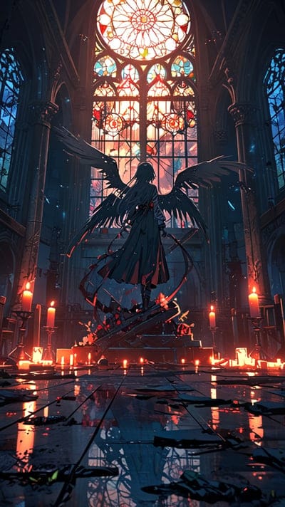 A lone angel with black wings stands in a dark, gothic cathedral. Vivid stained glass windows illuminate the scene, casting colored light on the stone architecture. Numerous candles flicker, casting an eerie glow and reflecting on the wet, polished floor. The atmosphere is mysterious and foreboding.